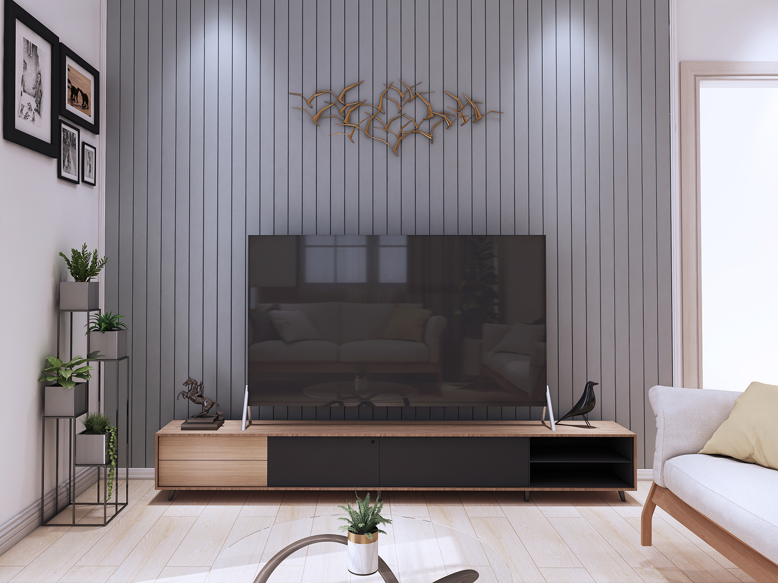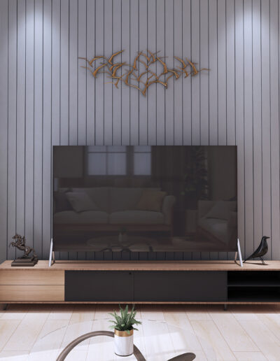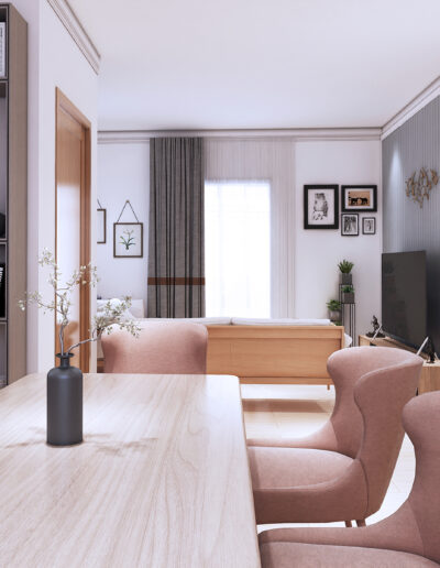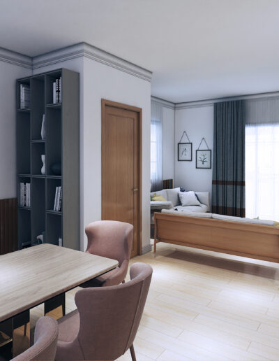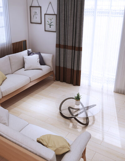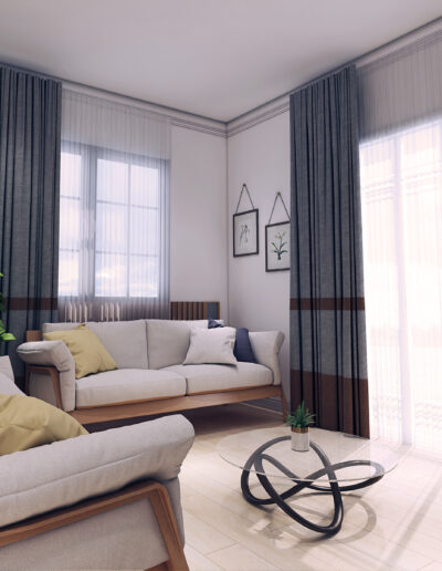 Design Project: Modern Contemporary Camp 7, Baguio City Design by ODEC Builders + TriGrid Interior Design A renovation of a mid-sized residence that is enclosed in ceramic wood tile for flooring, beige walls, accented with teal components, and neutral-toned furniture.